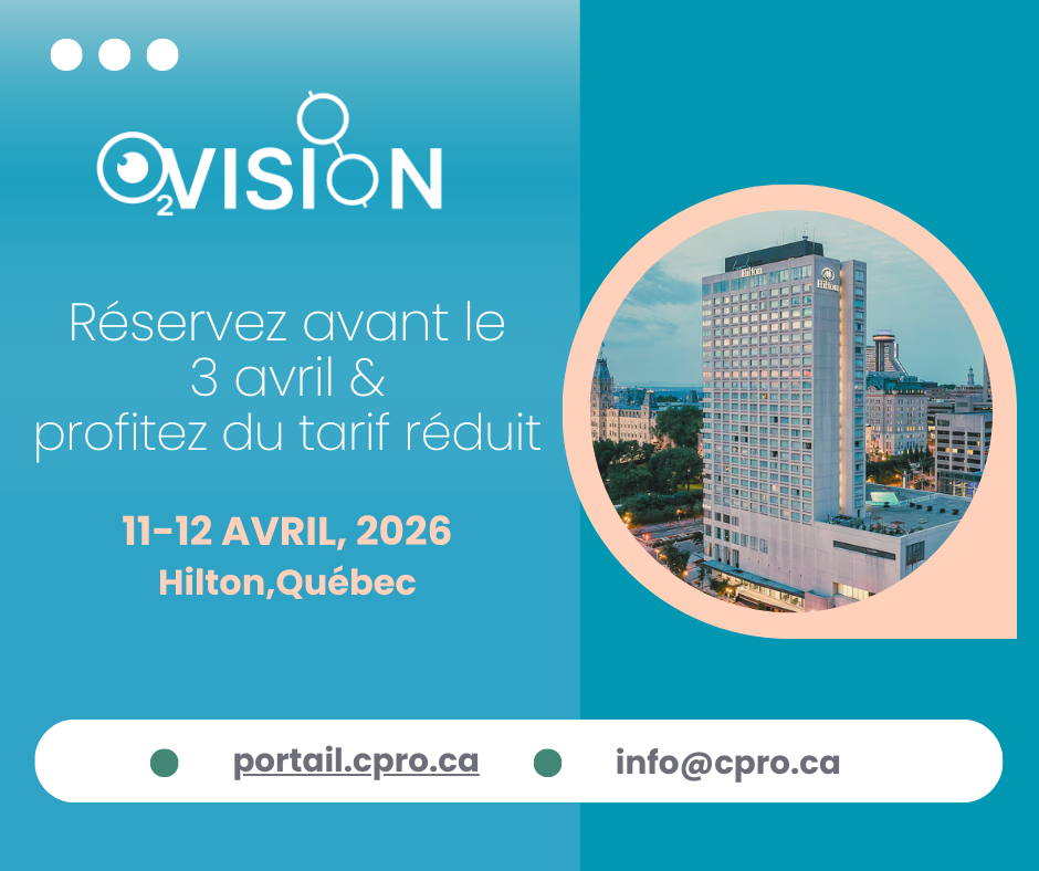 Bienvenue sur le portail du CPRO!Voici quelques informations importantes à retenir. Nom d’utilisateur - Numéro de permis à 6 chiffres de l’OOQ. Vous êtes optométriste et désirez vous créer un compte? Écrivez-nous à info@cpro.ca, il nous fera plaisir de vous assister. Vous représentez une entreprise? Nous offrons des opportunités uniques de visibilité sous plusieurs formats à travers nos différentes plateformes. Pour plus d'informations, communiquez avec directiongenerale@cpro.ca. Vous avez des questions sur le fonctionnement du nouveau portail, l'auto déclaration ou nos formations ? Visitez la section Foire aux questions de notre site web pour plus d'informations. | O2 Vision | Québec 2026 11 et 12 avril 2026 Date limite pour tarif d'inscription réduit: 3 avril